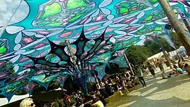 - Escenario principal, donde suenan ritmos fluidos de psytrance o goa trance. La plataforma de DJ está decorada con un techo sobre la pista de baile. Estas construcciones tienen «colores fluorescentes que brillan más a medida que cae la oscuridad y el espectáculo de luces aumenta en intensidad».[4]