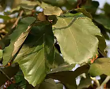 Las hojas del árbol son palmeadas de crucería y tienen estípulas. Las hojas crecen alternas. La forma de la hoja puede variar entre oblonga, ampliamente obovadas a ovadas. Los bordes de las hojas son comúnmente dentados o irregularmente lobulados. Muchas hojas tienden a inclinarse hacia abajo, dando el árbol la apariencia de que está marchito, cuando en realidad podría tener una cantidad suficiente de agua disponible. La parte superior de las hojas es de color verde oscuro con una textura glabrescente. Las hojas son ásperas y elásticas para limitar la pérdida de humedad en un clima caliente. El lado inferior de las hojas va desde un color de plata para la oxidación y son pubescente. La corteza del árbol es de color gris y se considera que es bastante suave. Las pequeñas ramitas y un nuevo crecimiento a veces pueden parecer plumas y son comúnmente de un color marrón oxidado. Las hojas tienen una base de hoja peltada, lo que significa que la inserción del pecíolo está en el centro de la hoja.