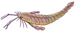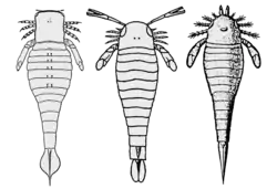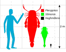 ![]() Representantes de las tres familias de pterigotioideos (de izquierda a derecha); Slimonidae (Slimonia), Pterygotidae (Erettopterus) y Hughmilleriidae (Hughmilleria). | ||