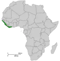 Se encuentra en Costa de Marfil, Guinea, Senegal, Sierra Leona y, posiblemente en Guinea-Bissau y Liberia.