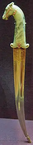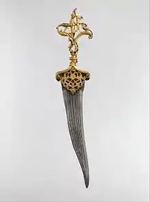 Un puñal es un cuchillo con una punta muy afilada y generalmente dos bordes afilados, típicamente diseñado o capaz de usarse como arma de empuje o apuñalamiento.[37][38] Los puñales se han utilizado a lo largo de la historia de la humanidad para enfrentamientos de combate cuerpo a cuerpo,[39] y muchas culturas han utilizado puñales adornados en contextos rituales y ceremoniales. La forma distintiva y el uso histórico del puñal o daga la han hecho icónica y simbólica. Un puñal o daga en el sentido moderno es un arma diseñada para el combate a corta distancia o la autodefensa; debido a su uso en ensamblajes históricos de armas, tiene asociaciones con asesinatos y asesinatos. Los cuchillos de doble filo, sin embargo, juegan diferentes tipos de roles en diferentes contextos sociales.