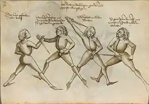 Estas técnicas se asemejan en algunos aspectos a la lucha con cuchillo moderna, pero enfatiza los golpes de empuje casi exclusivamente, en lugar de los cortes y tajos. Cuando se utilizaba de forma ofensiva, un ataque estándar empleaba frecuentemente la empuñadura inversa o picahielo, apuñalando hacia abajo con la hoja para aumentar el empuje y la fuerza de penetración. Esto se hacía principalmente porque la punta de la espada tenía que penetrar o separar la cota de malla o la armadura de placas de un oponente para causarle una herida. La desventaja de emplear la daga medieval de esta manera era que podía ser fácilmente bloqueada por una variedad de técnicas, más notablemente por un bloqueo con el brazo sin arma mientras se atacaba simultáneamente con un arma sostenida en la mano derecha. Otra desventaja era la reducción del alcance efectivo de la hoja hacia el adversario cuando se utilizaba una empuñadura invertida. A medida que el uso de la armadura caía en desgracia, comenzaron a evolucionar las técnicas de lucha con daga que enfatizaban el uso de la daga con una empuñadura convencional o hacia delante, mientras que la empuñadura inversa o de picahielo se mantenía cuando se atacaba a un oponente desprevenido por detrás, como en un asesinato.