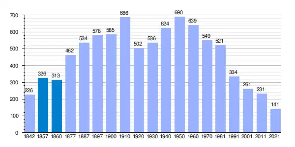 | Gráfica de evolución demográfica de Puebla de Azaba[6] entre 1842 y 2021 |