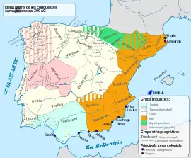 En el I milenio a. C. la península ibérica estaba habitada por los denominados historiográficamente pueblos prerromanos. Recibieron el nombre colectivo de Iberos los de la franja mediterránea y valles del Ebro y Guadalquivir, mientras que los del interior se asociaban a la influencia cultural celta. Debe evitarse considerar tales denominaciones como reflejo de una unidad étnica o cultural que estuvo muy lejos de producirse.