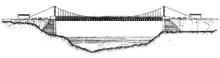 La flecha proyectada para las catenarias era de un onceavo de la luz, alta para lo usual, y la del tablero de solo 40 cm. Las péndolas se proyectaron con barras de acero en vez de con cables, y el tablero y las barandillas con sólidos entramados de madera, todo ello con la intención declarada de vencer una de las principales dificultades que afrontaba esta tipología estructural en la época de sus inicios: el exceso de flexibilidad y la falta de inercia que producían movimientos intolerables de la estructura, y frecuentemente la ruina del puente.[6]