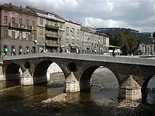 El puente tiene cuatro arcos y se apoya en tres fuertes pilares y el dique; está construido de piedra y yeso y sus dos aperturas ("ojos") encima de los pilares son tan característicos que aparecen en el escudo de Sarajevo. Debido al fuerte tráfico en la época del Imperio Austro-Húngaro, se añadieron al puente las aceras.