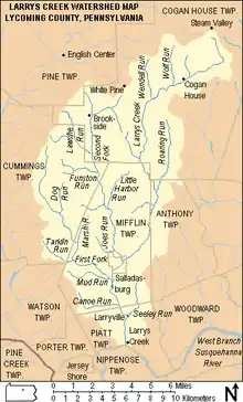 En 1900, quedaban cuatro puentes cubiertos en Larrys Creek: yendo aguas arriba estaban en la aldea de Larryville en Piatt Township, en o cerca de Mud Run en el municipio de Mifflin, en Salladasburg, y en el municipio de Cogan House.[6] Desde 2011, el puente cubierto de Cogan House es el más antiguo y el más largo de los tres puentes cubiertos del siglo XIX que quedan en el condado de Lycoming (los otros son el puente cubierto de Buttonwood en el municipio de Jackson, sobre el río Blockhouse, y el Lairdsville en el municipio de Moreland municipio sobre el río Muncy).[5]