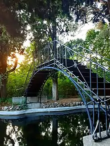 El Puente de hierro del parque salva una pequeña ría, que recorre los jardines de esta finca histórica. Presenta un trazado muy simple, que, en cierto sentido, emula el diseño de los puentes venecianos.