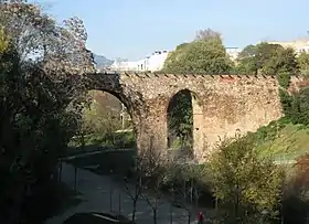 Se trata de un puente monumental construido sobre el torrente de Vallparadís como nexo de unión entre la villa de Tarrasa y el pueblo de San Pedro. Consta de tres arcos de diferente anchura, el central de medio punto, más ancho, y los laterales con arco apuntado. Está construido en tabicado común, excepto en zonas angulares que son sillares. La altura máxima es de 19,30 m, la longitud de 57 m y la anchura, 3,50 m.[1]