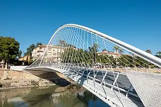 Se inauguró el 9 de enero de 1999, dos meses después de la fecha prevista, por parte del alcalde de Murcia en aquel entonces, Miguel Ángel Cámara, con la presencia del arquitecto Santiago Calatrava, que declaró haber "modernizado la imagen de Murcia". En un primer momento se planificó que tanto este puente como la reforma del puente del Hospital (también obra de Calatrava), se inauguraran a la vez, pero el retraso en la llegada de materiales para este último puente lo imposibilitó.[1]