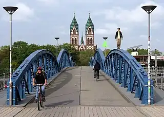 ![]() El puente, ciclistas, un marchador sobre los arcos, la iglesia del Corazón de Jesús en el trasfondo | ||