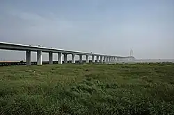 La construcción se inició el 8 de junio de 2003 y su inauguración fue el 14 de junio de 2008.[1][2] El puente tiene una longitud de 35 763 m, con 6 carriles (tres por sentido) más los dos arcenes. Esto le convierte en el tercer puente más largo del mundo después de la calzada del lago Pontchartrain, en el estado estadounidense de Luisiana y del de la bahía de Jiazhou en la ciudad costera oriental de Qingdao en la República Popular China.