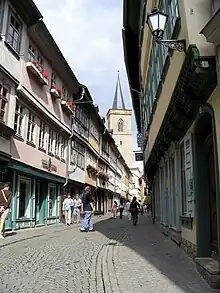 El Krämerbrücke («Puente de los Mercaderes»), en Erfurt, de madera originalmente, fue reconstruido en piedra en 1325 en el amplio brazo del Gera. Después del gran incendio de 1472, la ciudad decidió erigir en el puente 62 casas en las que los comerciantes tuvieran tienda y domicilio.