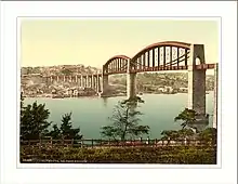 El hierro forjado permitió el desarrollo de grandes estructuras trianguladas, con ejemplos tan destacables como el puente Royal Albert (1859; dos arcos de 135 m de luz) de Isambard Kingdom Brunel sobre el estuario del río Tamar,[8] y las numerosas obras proyectadas por el francés Gustave Eiffel, diseñador del viaducto de Garabit (1886; un arco de celosía de 165 m de luz) y del puente Don Luis I (1886; un arco de celosía de 174 m de luz) en Oporto junto con su socio Théophile Seyrig. Otra obra singular de hierro forjado, aunque concebida para cargas más ligeras que las del ferrocarril, fue el puente colgante de Clifton (1864; vano central de 214 m de luz) en Bristol, un puente suspendido de cadenas proyectado a partir de una propuesta de Brunel.[9]