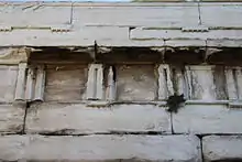 Durante la demolición del monumento corégico de Nicias, las partes estructurales fueron numerados mientras aún estaban in situ, lo que permitió volver a montarlos correctamente dentro de la puerta.[36][37] El friso dórico del Monumento corégico, construido con piedra caliza y mármol, se reconstruyó a lo largo de la parte superior de la Puerta Beulé, aunque el arquitrabe del Monumento corégico, que originalmente formaba una única viga horizontal, se dividió en dos partes, una por encima y otra por debajo del friso de la puerta.[26] El arqueólogo Jeffrey M. Hurwit ha descrito la reutilización del monumento corégico como un «clasicismo contado dos veces», ya que el monumento original estaba inspirado en laos Propileos, por lo que su reutilización creaba una armonía arquitectónica entre la puerta Beulé y los Propileas a la que conducía.[38]