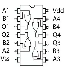 ![]() Diagrama de pinout de un CI NOR 4001 formato DIP |