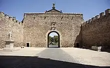 Está formada por dos cuerpos independientes con dos altos muros almenados que los unen, formando un patio entre ellos,[8] donde se encuentra una estatua de Carlos V.[9] El lado externo está formado por un arco de medio punto con sillares almohadillados, sobre el que se encuentra un gran escudo de la «Ciudad Imperial», con su águila bicéfala,[8] además de un frontón con una escultura de un ángel custodio.[9] Flanquean esta entrada dos grandes torreones circulares. El cuerpo que da a la ciudad tiene otra puerta de arco de medio punto, flanqueada por dos torreones cuadrados rematados por tejados piramidales.[9]