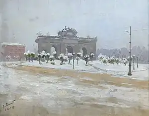 En 1872 el Ayuntamiento de Madrid decide realizar la transformación propuesta e inicia su construcción junto con el barrio de Salamanca gracias a la intervención del marqués de Salamanca.[30] Las intervenciones realizadas sobre la plaza posteriormente a mediados del siglo XX (debidas a los arquitectos: Secundino Zuazo y Pascual Bravo) dejaron el entorno inalterable desde mediados del siglo XIX hasta la actualidad. La plaza de toros que había en sus inmediaciones se clausura el 19 de abril de 1874 y se abre una nueva en el solar que ocupa en la actualidad el Palacio de Deportes, inaugurándose el 4 de septiembre de 1874 hasta su cierre posterior en 1934,[31] plaza que se acaba trasladando a Las Ventas. En el año 1886, a escasos quinientos metros de la puerta de Alcalá, se inaugura una estatua ecuestre de Baldomero Espartero.