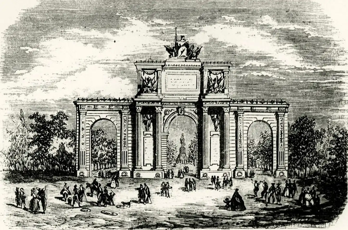 Puerta de Santa Engracia. Esta puerta, de grandes proporciones, aunque de pesada forma, se empezó á construir en el año 1830, habiéndose suspendido las obras en 1835. En 3 de junio de 1819 habia mandado ya el rey Fernando VII que se erigiese junto á las ruinas del convento, para recordar el heróico esfuerzo, el valor y el sufrimiento de los defensores de la ciudad en los memorables asedios durante la guerra de la Independencia. Tiene tres ingresos en el centro, destinados para el paso de las personas, y dos puertas laterales que sirven para el tránsito de coches y caballerías. Se halla por concluir, y en el dia se ocupa el escelentísimo Ayuntamiento de que tenga efecto su terminacion, habiendo llamado ya á concurso á los artistas, que han querido tomar parte, con objeto de ver y elegir el modelo para transformarla en arco de triunfo. Formáronse varios proyectos, y segun parece hasta se ha propuesto que la puerta de santa Engracia sea trasladada con el tiempo frente al puente de este nombre, dejando el paseo de la Glorieta y el monumento de Pignatelli dentro de la ciudad.(Andrés, 1860, p. 515)