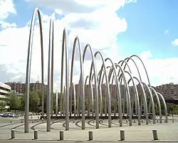 Está realizada en acero inoxidable y mide 23 m de alto, 84 de largo y 33 de ancho. Consta de dos cuerpos paralelos, integrados, cada uno de ellos, por una sucesión de trece arcos de medio punto, separados entre sí. Son conocidos popularmente como los arcos. La altura de los arcos varía siguiendo un orden creciente o decreciente en función de su situación en uno u otro cuerpo. Los trece ubicados en el cuerpo meridional disminuyen en altura siguiendo la dirección oeste-este, mientras que los trece restantes, correspondientes al cuerpo septentrional, lo hacen en sentido inverso.