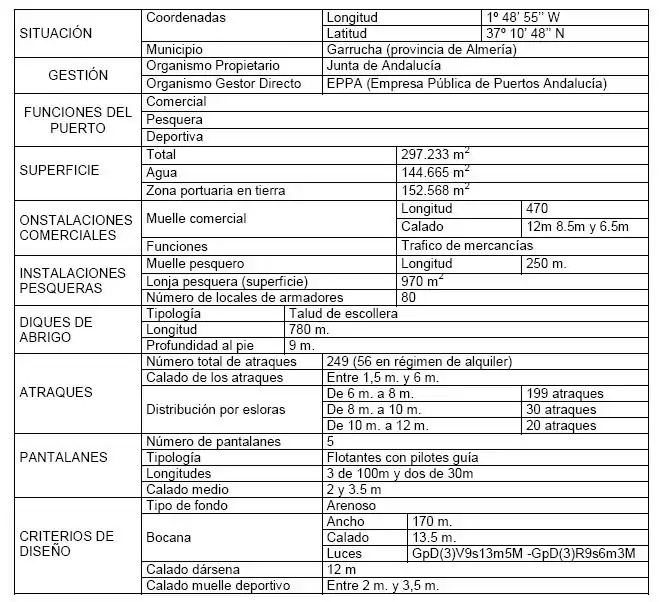 - Organismo gestor: Empresa Pública de Puertos de Andalucía, la cual tiene arrendados 5 pantalanes de la zona deportiva al Club Náutico Garrucha con un total de 227 amarres y ella gestiona directamente el antiguo espigón del puerto con 22 amarres destinados a barcos deportivos.