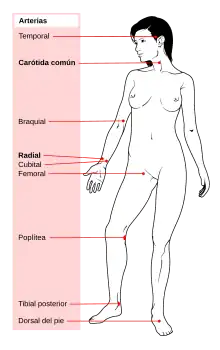 - Pulso carotídeo, en el cuello (arteria carótida). La carótida debe palparse suavemente, ya que estimula sus barorreceptores con una palpación vigorosa puede provocar bradicardia severa o incluso detener el corazón en algunas personas sensibles. Además, las dos arterias carótidas de una persona no deben palparse simultáneamente, para evitar el riesgo de síncope o isquemia cerebral.
