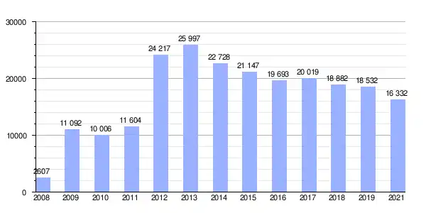 | Gráfica de evolución demográfica de Punta Umbría[6] entre 1970 y 2021 |