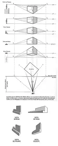 La distancia existente entre el observador y el plano geometral se ve reflejada en la altura H (distancia entre la L.H. y la L.T.). La visión que se obtiene del objeto difiere notablemente con la situación del punto de vista, como se observa en la ilustración. En este tipo de representaciones, tanto de interiores como de exteriores, se establece, normalmente, una altura para la línea del horizonte (aproximadamente la media de una persona) 1,70 o 1,20 metros, según se considere de pie o sentado. Un punto de vista bajo (perspectiva de rana) muestra una menor proporción del plano de tierra, a la vez que disminuye la distancia entre la línea del horizonte y la de tierra. Con este tipo de perspectiva se consigue resaltar la altura de los objetos. La representación de conjuntos arquitectónicos a “vista de pájaro” es muy empleada para ofrecer claramente la distribución urbanística. En este caso, la L.H se eleva muy por encima de la L.T. En la vista celeste se sitúa la L.T. por encima de la L.H. de manera que podamos visualizar la planta inferior del objeto...