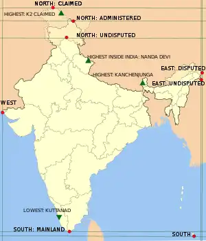 El punto más al norte y el punto más alto que la India afirma están en el estado en disputa de Cachemira. India reclama que todo el estado es disputado por Pakistán, con el territorio actualmente dividido en Cachemira administrada por Pakistán y el estado bajo administración india de Jammu y Cachemira.[1] Esta lista recoge el punto más al norte, como alega la India, el más al norte en disputa que es administrada por la India, y el punto más al norte no discutido en la India. Este caso se aplica también a las regiones de más elevación.