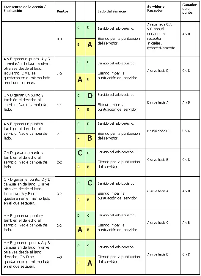 En un partido de dobles A y B contra C y D. A y B ganan el sorteo y deciden servir. A sirve hacia C. A será el servidor inicial, mientras que C será el receptor inicial.