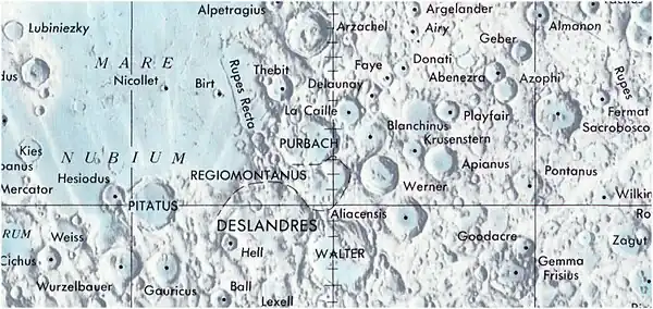 Por convención estos elementos son identificados en los mapas lunares poniendo la letra en el lado del punto medio del cráter que está más cercano a Purbach.