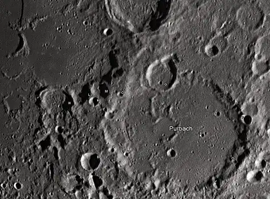 Purbach es un gran cráter de impacto localizado en las tierras altas del sureste de la Luna. El desfigurado cráter Regiomontanus está unido a su borde sur. Al noroeste se halla Thebit y justo al noreste se encuentra La Caille.