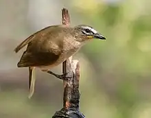 El bulbul cejiblanco (Pycnonotus luteolus)[2] es una especie de ave paseriforme de la familia Pycnonotidae residente de Sri Lanka y el subcontinente indio. Su plumaje en gran parte es de color olivo sobre las partes inferiores blanquecinas, tiene una pálida lista superciliar y una cloaca amarillenta. Se encuentra en hábitats de matorrales densos y se esconde dentro de la vegetación, puede ser difícil de observar, aunque sus llamados fuertes y característicos son un distintivo.