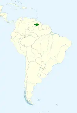 Se encuentra en las selvas húmedas de montaña de Brasil, Guyana y Venezuela,[1] entre los 700 y 1 800 metros de altitud.