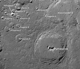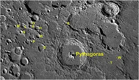 Por convención estos elementos son identificados en los mapas lunares poniendo la letra en el lado del punto medio del cráter que está más cercano a Pitágoras.
