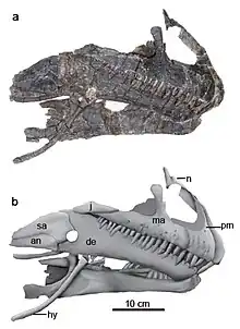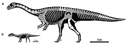 ![]() Esqueletos reconstruidos de un adulto y un juvenil (no a escala). | ||