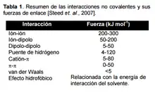 Ion-Ion: Esta interacción se presenta cuando dos especies con cargas opuestas están en contacto, por lo que no presentan dependencia de la direccionalidad. Un aspecto que afecta la estabilidad de la interacción es la fuerza iónica del medio, la cual puede ser analizada empleando la ecuación de DebyeHückel. Para el desarrollo de estas interacción se suele utilizar disolventes con constantes dieléctricas bajas como el cloroformo, acetonitrilo o diclorometano y evitar el agua en el medio ya es altamente competitivo.