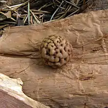 Una nuez de quandong del desierto puesto en una trozo de corteza de papel.