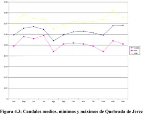 Su caudal es muy parejo durante el año y el periodo de estiaje alcanza los 90 l/s.[5]: 175 La publicación de 2004 de la DGA muestra un diagrama de mediciones mensuales con un promedio de aproximadamente 60 l/s.[1]: 29
