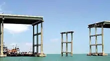 En la madrugada del 15 de septiembre de 2001, cuatro barcazas cargadas se estrellaron contra una de las columnas de soporte del Queen Isabella Causeway, que viajaban a 0,2 millas por hora (0,3 km/h). La alisión provocó que dos tramos de 80 pies (24,4 m) cayeran al agua, dejando un hueco de 160 pies (48,8 m) en la calzada.[4] Las secciones colapsadas estaban justo al lado del punto más alto de la calzada, lo que dificultaba que los conductores que se acercaban se dieran cuenta.[1] Ocho personas murieron cuando sus automóviles cayeron 26 m (85 pies) al agua. Se recuperaron cinco vehículos del agua junto con tres supervivientes.[5][6]