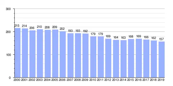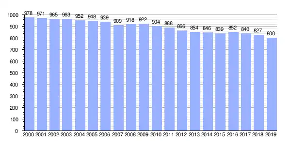 | Gráfica de evolución demográfica de Queiruga (parroquia) entre 2000 y 2019 |