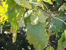 Tronco derecho, robusto, con corteza pardo-grisácea o cenicienta, resquebrajada en grietas poco profundas, longitudinales y transversales, en los ejemplares más viejos. Ramillas jóvenes cubiertas de abundantes pelos. Hojas adultas algo coriáceas, muy variables según el origen, de 6 a 18 cm, elípticas o alargadas y con figura de punta de lanza, tienen el borde festoneado, con dientes gruesos, poco profundos y nervios laterales muy pronunciados, por la cara inferior, de forma regular casi paralelos.