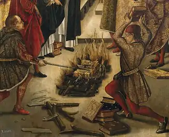 - En 333 Constantino I, mediante su Epístola a los obispos y los pueblos, ordenó quemar todos los escritos de Arrio y sus partidarios bajo pena de muerte para quien no cumpliera su mandato, estableciendo así un precedente que posteriormente seguirían otros emperadores cristianos.[1]