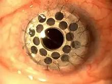 La queratoprótesis es una prótesis fabricada de un material transparente, con la que se sustituye mediante una intervención quirúrgica, la córnea natural de un paciente.[1]