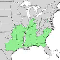 Es nativa de la llanura costera del Atlántico, principalmente de Carolina del Norte hasta el norte de Florida y al oeste con el centro de Texas; también se encuentra al norte, en el valle del río Misisipi hasta el centro de Oklahoma, el este de Kansas, Missouri, el sur de Illinois, Indiana, el oeste y el sur de Ohio, Kentucky y Tennessee. Se encuentra localmente del norte hasta el sur de Michigan, el sur de Pennsylvania, Maryland, y el extremo sur de Ontario, Canadá.