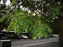 Las hojas están dispuestas alternativamente y son ampliamente obovadas con 5-9 lóbulos, cada uno de los cuales están terminados por los dientes de cerdas de punta. Las hojas maduras de entre 10 a 21 centímetros de longitud. Las superficies son glabras, a excepción del mechón insertado en la vena axilar. Son oscura verde en la parte superior, mientras que el fondo es de un tono ligeramente más claro de verde. Las hojas se vuelven marrones a rojo en el otoño, y en algún momento puede tener tonos de amarillo. Los colores del otoño son relativamente tardíos; especímenes en el centro de Texas pueden estar rojos a principios de diciembre, mientras que en Florida los especímenes pueden no colorear sustancialmente hasta febrero. Tiene relativamente grandes bellotas , que típicamente alcanzan hasta 3 centímetros de diámetro. Las bellotas toman entre 1,5 y 3 años de maduración total, y pueden pasar desapercibidos durante sus primeras etapas de desarrollo.