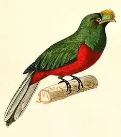 El quetzal crestado (Pharomachrus antisianus), también conocido como quetzal de cola blanca,[2] es una especie de ave trogoniforme de la familia Trogonidae.[3] Es nativo de Bolivia, Colombia, Ecuador, El Perú, y Venezuela. Vive en el bosque montano húmedo tropical y subtropical.[1] No tiene subespecies.[3]