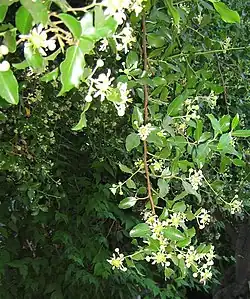 Flor: es hermafroditas, polígamo dioica, con 3 a 5 pedicelos y 2 brácteas, siendo el pedicelo central el femenino y masculinas las de los costados. Pentámeras, de forma estrellada, formada por 5 pétalos, 5 sépalos, 10 estambres y 5 ovarios. Es de color blanco-amarillas, de 15 mm de diámetro.
