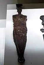Por su parte, su mano izquierda parece agarrar los pliegues de la túnica o alguna clase de objeto —¿tal vez un rollo de papiro?—, pero el estado del monumento impide pronunciarse.