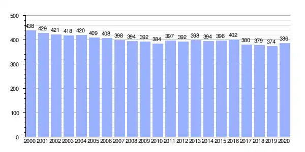 | Gráfica de evolución demográfica de Régoa entre 2000 y 2020 |